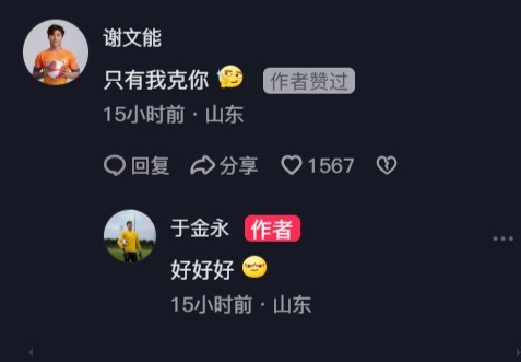 在評論區(qū),U20國足前鋒杜月徵與他互動,杜月徵評論道,你是真好,于金永則回復(fù)你最好。謝文能也出現(xiàn)在評論區(qū),他寫道:“只有我克你”,于金永則回復(fù)好好好。