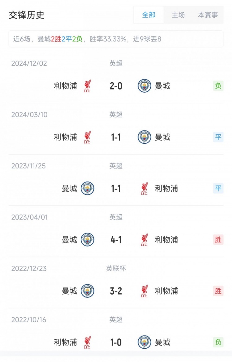 曼城vs利物浦交鋒歷史:利物浦歷史占優(yōu),近6次交手雙方各取2勝
