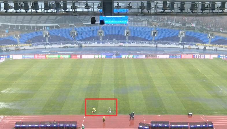 雨勢(shì)太大!西海岸主場(chǎng)工作人員在場(chǎng)邊剛畫完線,線又被雨沖模糊了