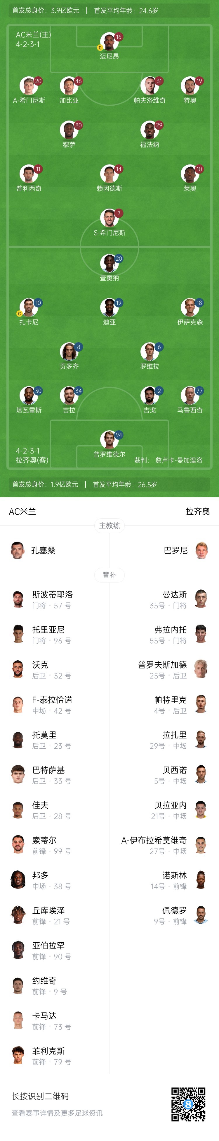 AC米蘭vs拉齊奧首發(fā):S-希門尼斯、萊奧、普利西奇先發(fā)