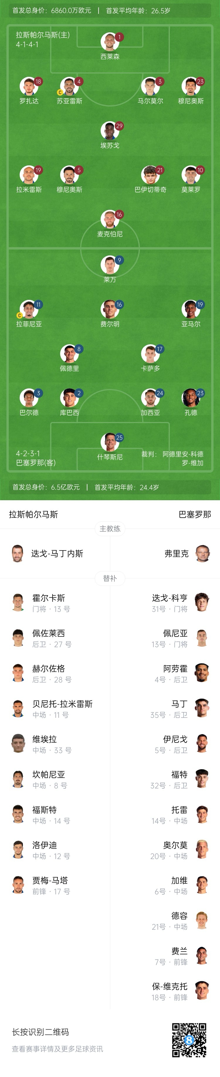 巴薩首發(fā):25-什琴斯尼、2-庫(kù)巴西、3-巴爾德、23-孔德、24-埃里克-加西亞、8-佩德里、16-費(fèi)爾明、17-卡薩多、11-拉菲尼亞、19-亞馬爾、9-萊萬(wàn)