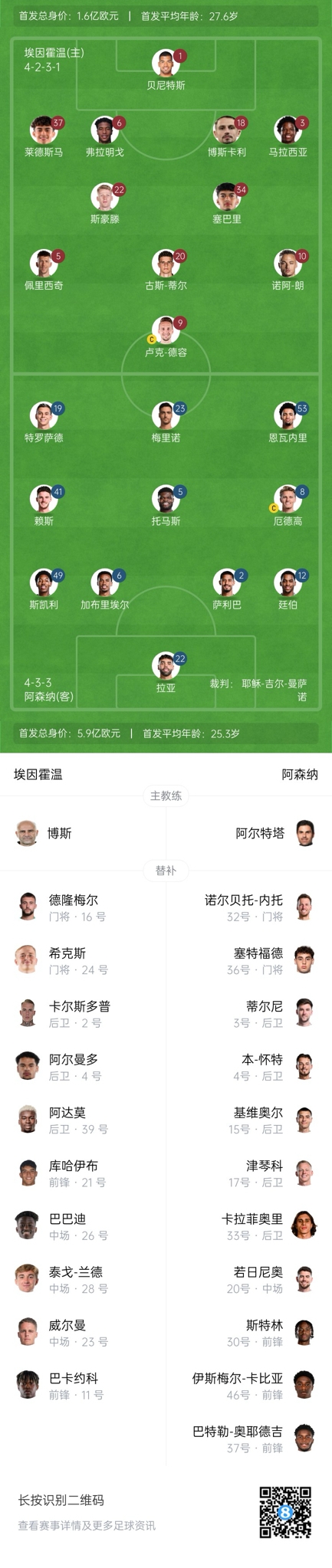 3月5日訊 歐冠1/8決賽首回合,埃因霍溫主場迎戰(zhàn)阿森納,賽前首發(fā)名單公布。