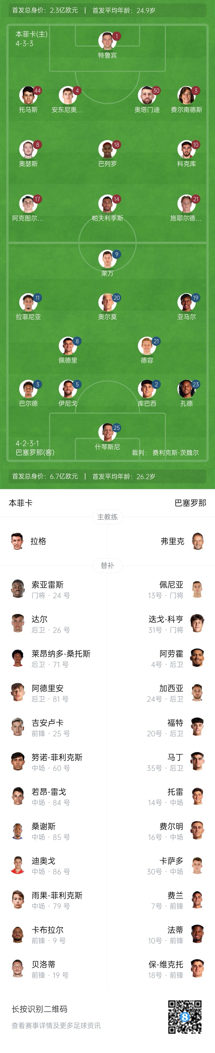 巴薩首發(fā):25-什琴斯尼、2-庫(kù)巴西、3-巴爾德、5-伊尼戈-馬丁內(nèi)斯、23-孔德、8-佩德里、21-德容、20-奧爾莫、19-亞馬爾、11-拉菲尼亞、9-萊萬(wàn)