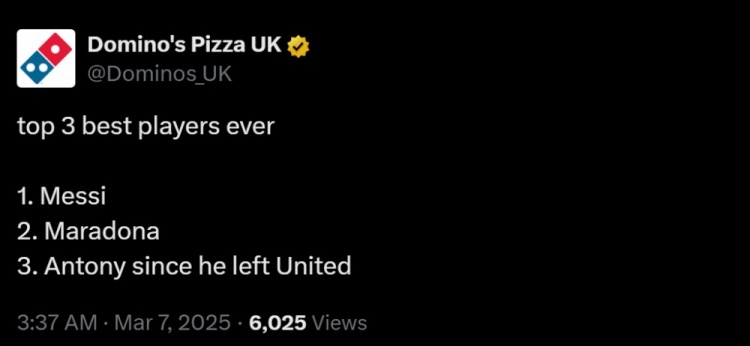 3月7日訊 歐聯(lián)杯1/8決賽首回合,貝蒂斯2-2戰(zhàn)平吉馬良斯。賽后,知名披薩連鎖品牌達美樂英國區(qū)官推盛贊安東尼。