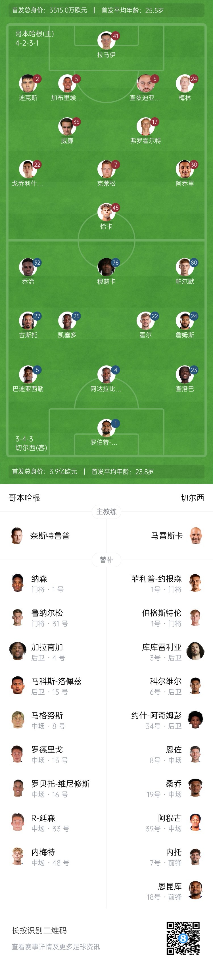 哥本哈根替補:1-納森-特羅特、31-魯納爾松、4-穆納什、15-馬科斯-洛佩茲、8-馬格努斯、13-羅德里戈-休斯卡斯、16-羅貝托-維尼修斯、33-R-延森、48-內(nèi)梅特